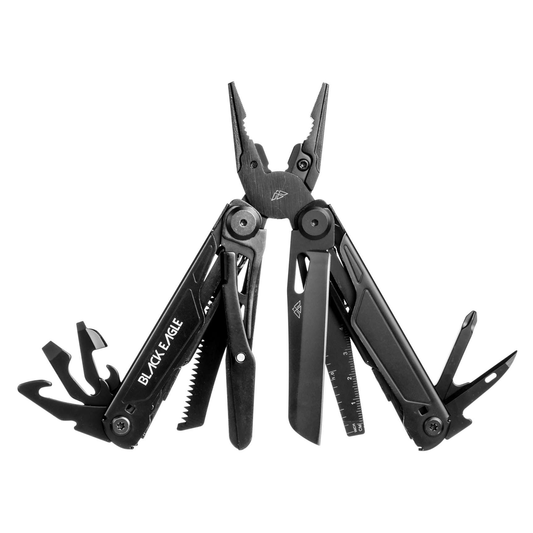 Met de Black Eagle Yukon multitool gaat u goed voorbereid op avontuur. Deze multitool heeft maar liefst 16 functies, waardoor u voor elke uitdaging de juiste oplossing bij de hand heeft. De tool is gemaakt van 5Cr15MoV RVS dat corrosiebestendig, taai en makkelijk te slijpen is. De tool is eenvoudig te openen en er is geen specialistische kennis nodig om hem te gebruiken. Bovendien zijn alle onderdelen, met uitzondering van de tang, vergrendeld voor extra veiligheid tijdens het gebruik.