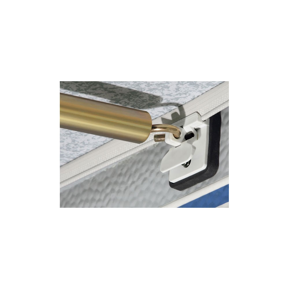 De Brand SHS schroefloze bevestiging is een set bevestigingsogen voor de dakstangen van een Brand voortent. Deze hoeven dus niet op de caravanwand gemonteerd te worden maar worden aan een extra pees in de voortent geschoven. Met de SHS frame ogen zijn lelijke of opvallende bevestigingsogen op de caravan niet langer nodig.