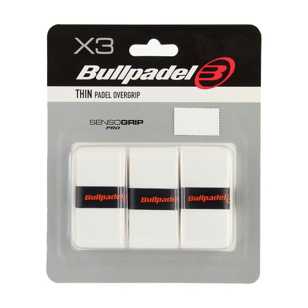 De Bullpadel GB-1603 overgrip is gemaakt met SensoGrip Pro technologie, waardoor deze overgrip 25% dunner is dan andere overgrips. In deze verpakking zitten drie witte Bullpadel overgrips, die het padelracket bij het handvat beschermen tegen slijtage en vocht opvangen, voor betere grip en comfort.