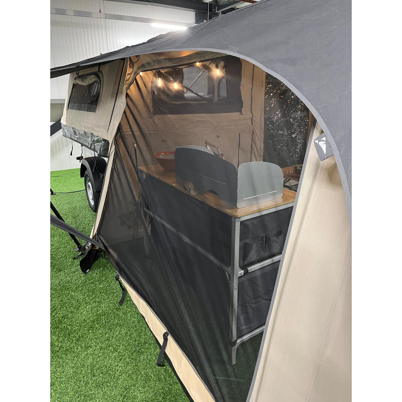 De Campooz Lazy Jack 24 - 25 Safari uitbreidingsset is heel makkelijk in te ritsen in de Campooz Lazy Jack 24 - 25 vouwwagen. Deze Campooz Safari uitbreidingsset, bestaande uit een voorwand en twee zijwanden, is gemaakt van verduisterend horrengaas. Hierdoor houdt u niet alleen ongedierte buiten, maar bent u ook beschermd tegen de zon, terwijl er tegelijkertijd genoeg ventilatie is. De wanden van deze uitbreidingsset kunt u vast ritsen aan de inbegrepen Trekking luifel van de Lazy Jack.