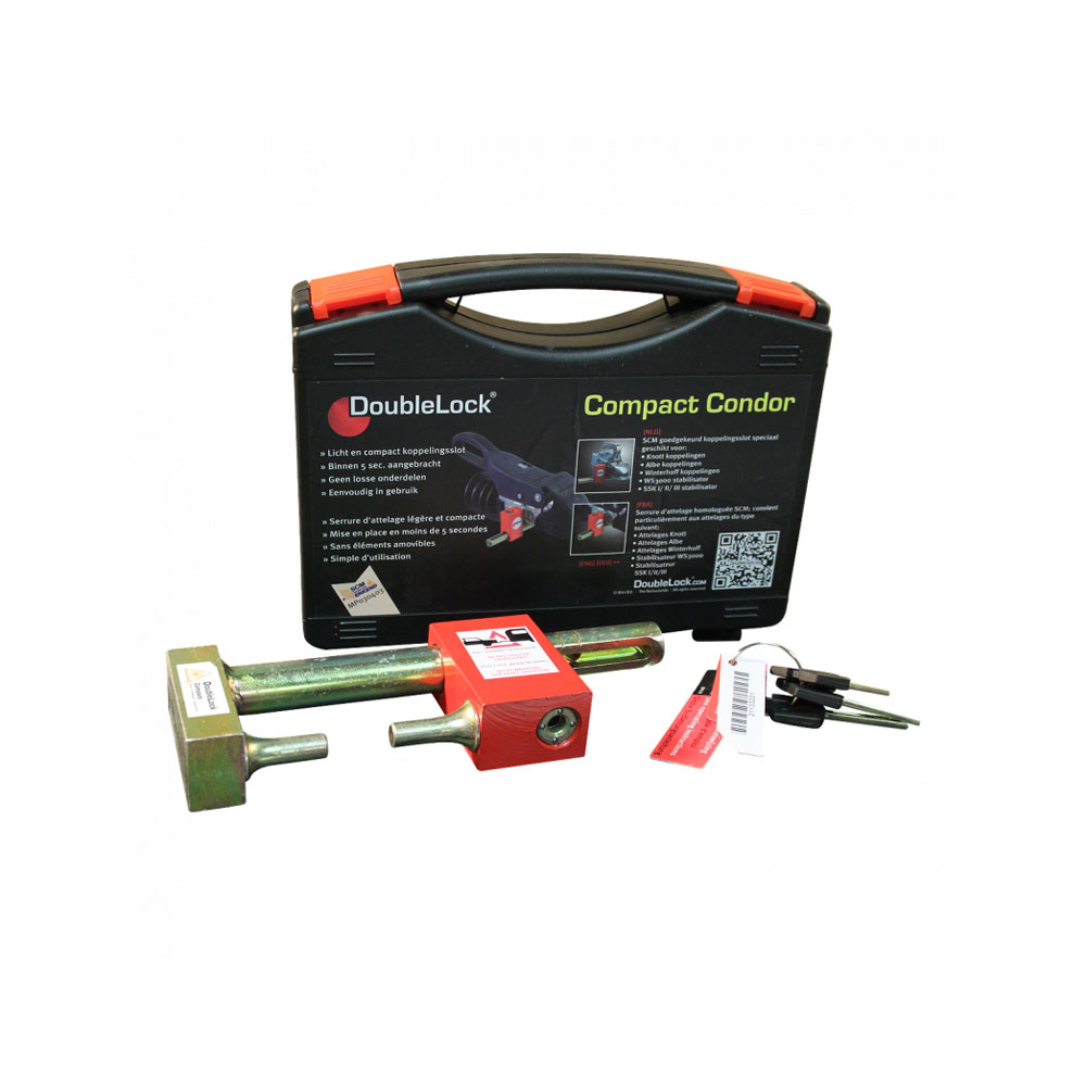 De DoubleLock Compact Condor is een zeer licht en compact koppelingsslot. Doordat het slot geen losse onderdelen heeft is het zeer eenvoudig in gebruik en binnen 5 seconden aangebracht. Het DoubleLock koppelingsslot wordt geleverd in een luxe en handige koffer met maar liefst vijf sleutels. Dit slot is SCM goedgekeurd. De Condor is geschikt voor de blauwe Winterhoff WS3000 (na 2003) en Westfalia SSK stabilisatorkoppelingen, maar ook voor de kogelkoppelingen van Knott, Albe, Winterhoff en Peitz.