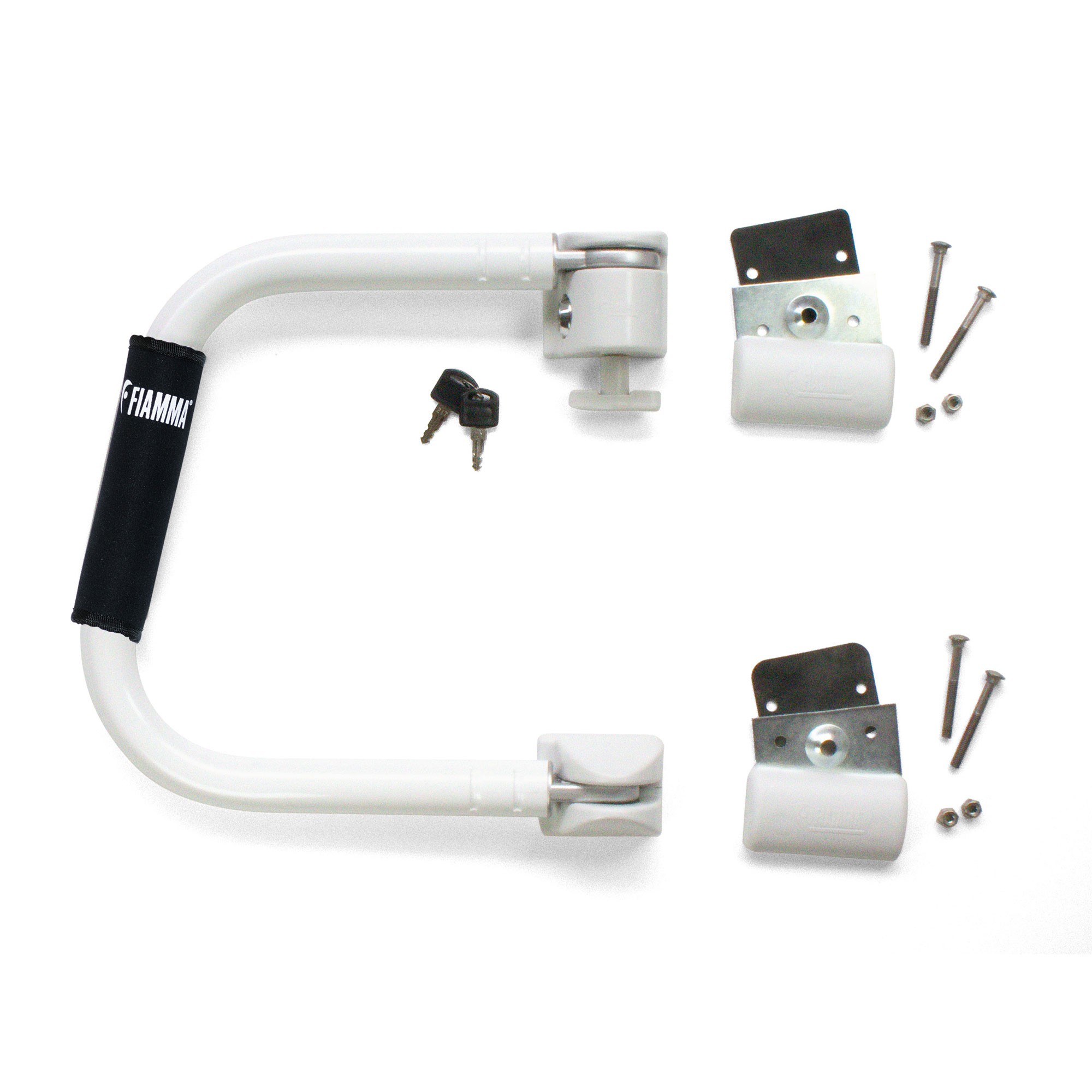 Elegante veiligheidsbeugel gemaakt van zeer stevig en solide, wit gelakt geanodiseerd aluminium met een diameter van 30 millimeter en een dikte van 2 millimeter. Voorzien van een zachte en veilige handgreep. Wanneer de beugel is dichtgeklapt op de deur beveiligt hij tegen inbraak en voorkomt hij het openklappen van de deur tijdens het rijden. Uitgeklapt dient de Security als handige instapbeugel wat het instappen in de caravan of camper vergemakkelijkt. De beugel past op alle deuren en kan zowel links als rechts geplaatst worden. Verder neemt hij weinig ruimte in beslag tijdens het rijden, omdat de beugel dan tegen de wand geklapt kan worden. De beugel wordt compleet geleverd met slot en sleutel, veiligheidshaak, montagebeugels en bevestigingsmateriaal.