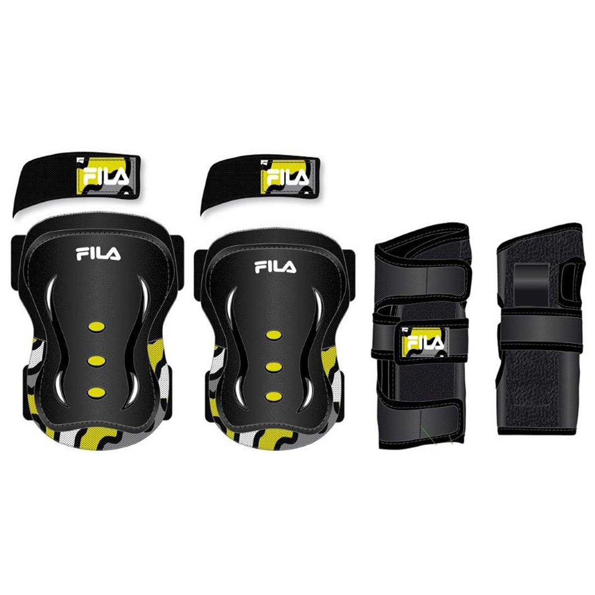 De Fila FP skate bescherming voor kinderen bestaat uit kniebeschermers, elleboogbeschermers en polsbeschermers. De verschillende protection onderdelen zijn makkelijk te bevestigen met een klittenbandsluiting en beschermen uw kinderen tijdens het skateboarden, skeeleren of waveboarden.