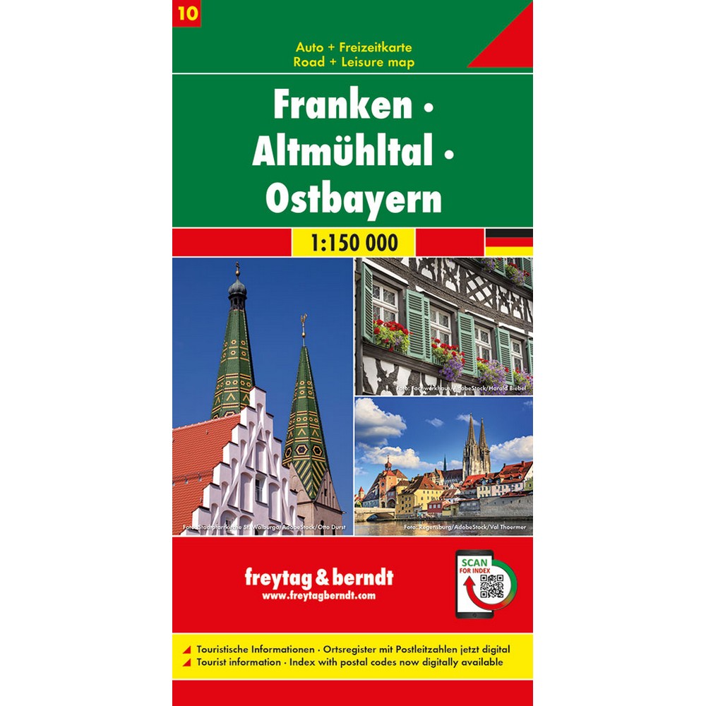 De freytag & berndt Franken Altmühltal Oost-Beieren vrijetijds- en wegenkaart heeft een schaal van 1 : 150.000 en is zeer eenvoudig in gebruik met de handige digitale index waar u via een QR-code op uw telefoon toegang tot heeft. Deze wegenkaart van freytag & berndt geeft niet alleen een goed overzicht van de wegen in dit gebied, maar geeft ook campings, toeristische informatie en verkeersinformatie aan.