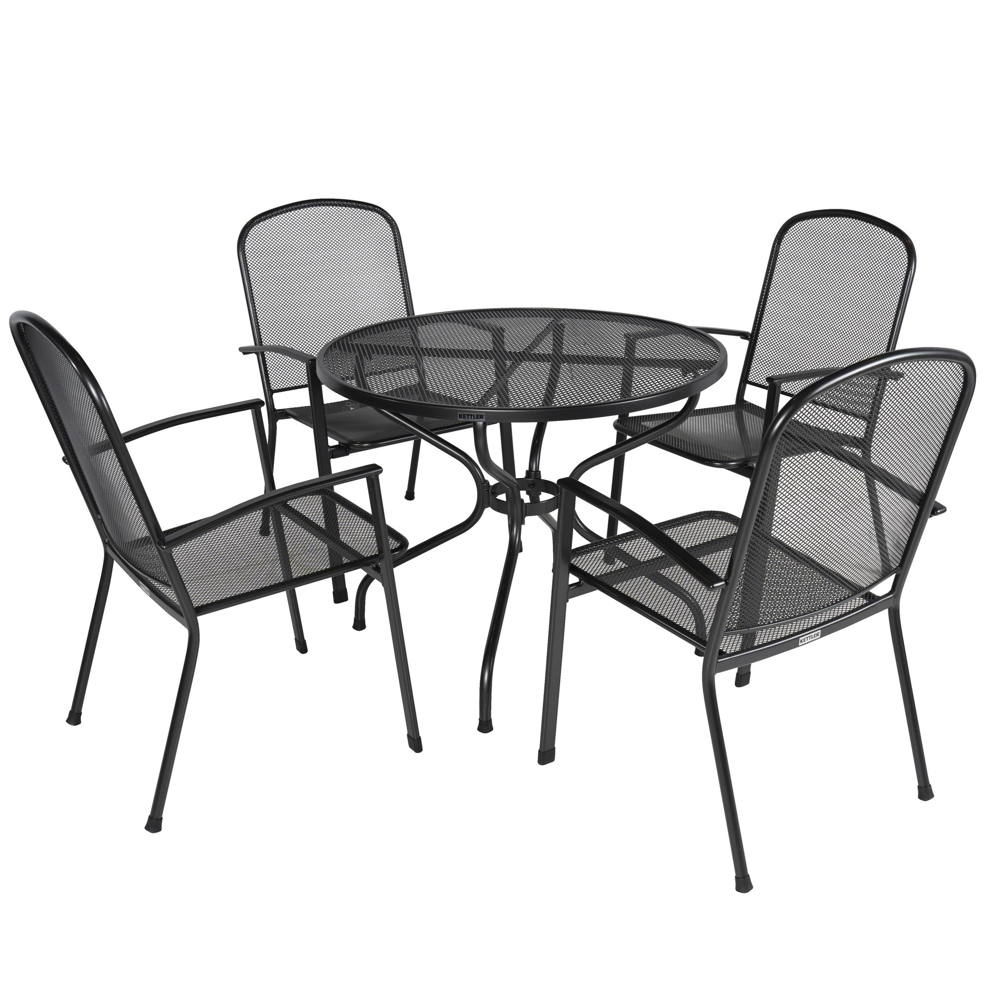 De Kettler Strek 90 Vigo tuinset in de kleur antraciet is een duurzame, moderne set en kan het hele jaar buiten blijven staan. De vormgeving is tijdloos en kan met verschillende tuinstijlen gecombineerd worden. De set bestaat uit vier stapelbare stoelen en een ronde tafel, beide gemaakt van staal en strekmetaal, behandeld met een speciale Kettlotherm beschermlaag. Deze laag is weerbestendig en zorgt ervoor dat de Vigo tuinset het hele jaar buiten kan blijven staan zonder last te krijgen van roest.
