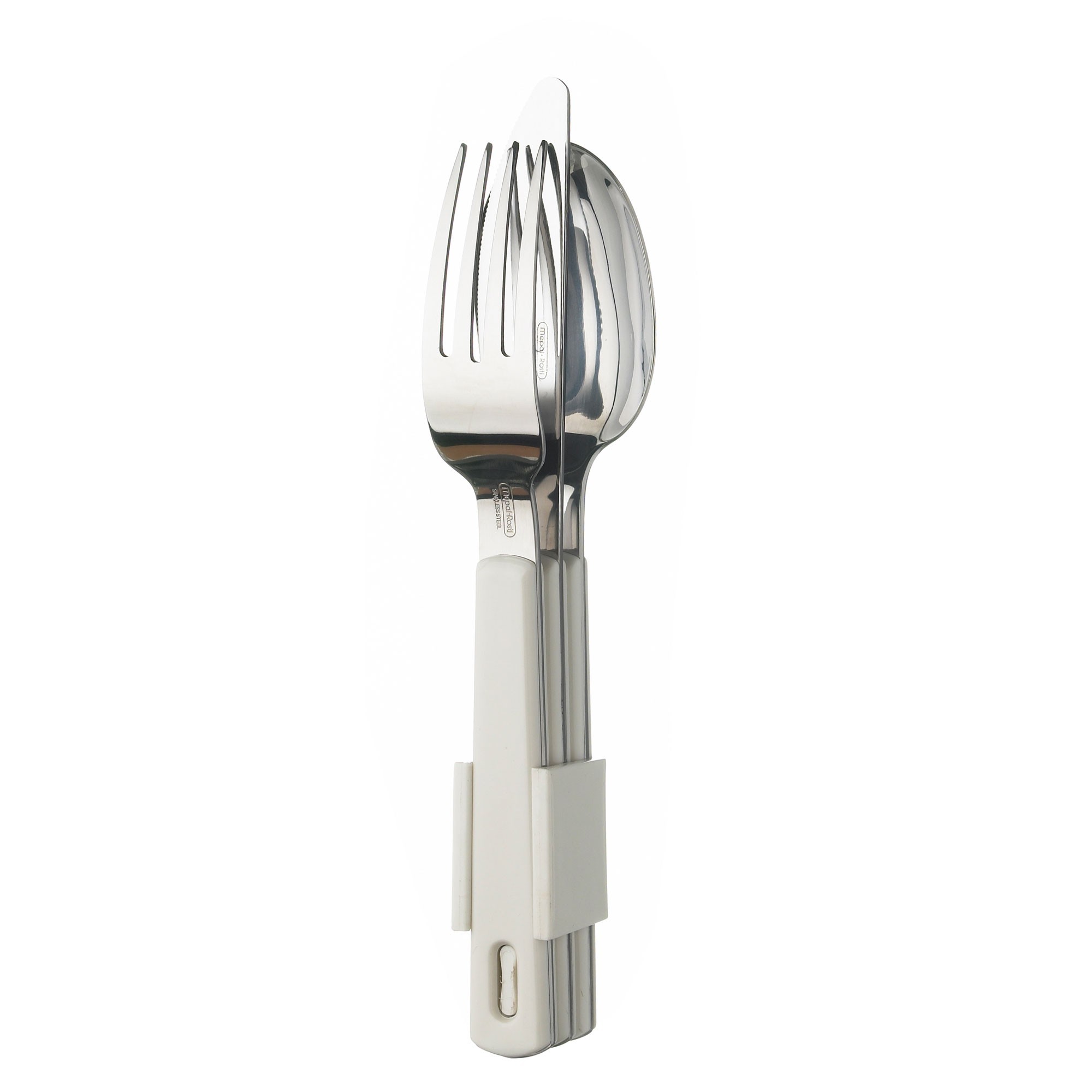 De Mepal 3-delige bestekset bestaat uit een vork, een mes en een lepel. Het bestek is bij elkaar te houden met behulp van de meegeleverde clip. De set neemt weinig ruimte in beslag en is eenvoudig mee te nemen naar de camping.
