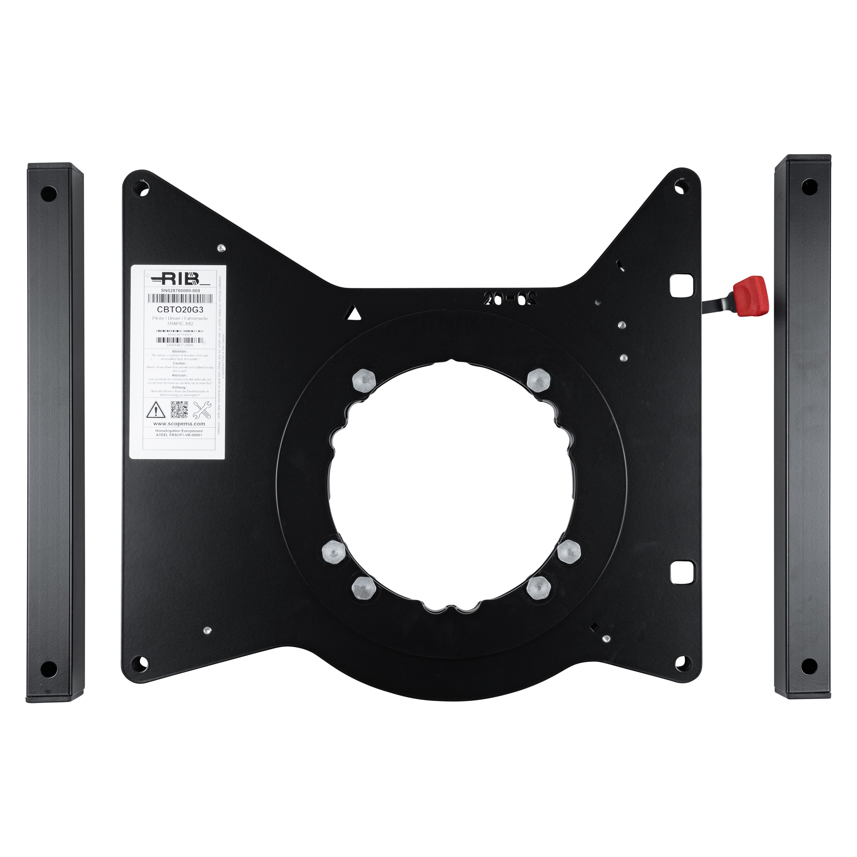 Het Scopema V3 draaiplateau is specifiek ontworpen voor de bestuurderstoel van een Renault Trafic of Opel Vivaro vanaf 2014 en een Nissan NV 300, Fiat Talento en Nissan Primastar vanaf 2016. Het plateau komt met een verhoger. Met de rode hendel ontgrendelt u moeiteloos de draaivoet en draait u de stoel naar de binnenkant van het voertuig. Voor optimale werking wordt aanbevolen de stoel leeg te draaien of met minimaal gewicht te belasten. De stoel kan vrij worden gedraaid tot een hoek van maximaal 180°, met automatische vergrendeling bij het terugplaatsen naar de rijpositie.