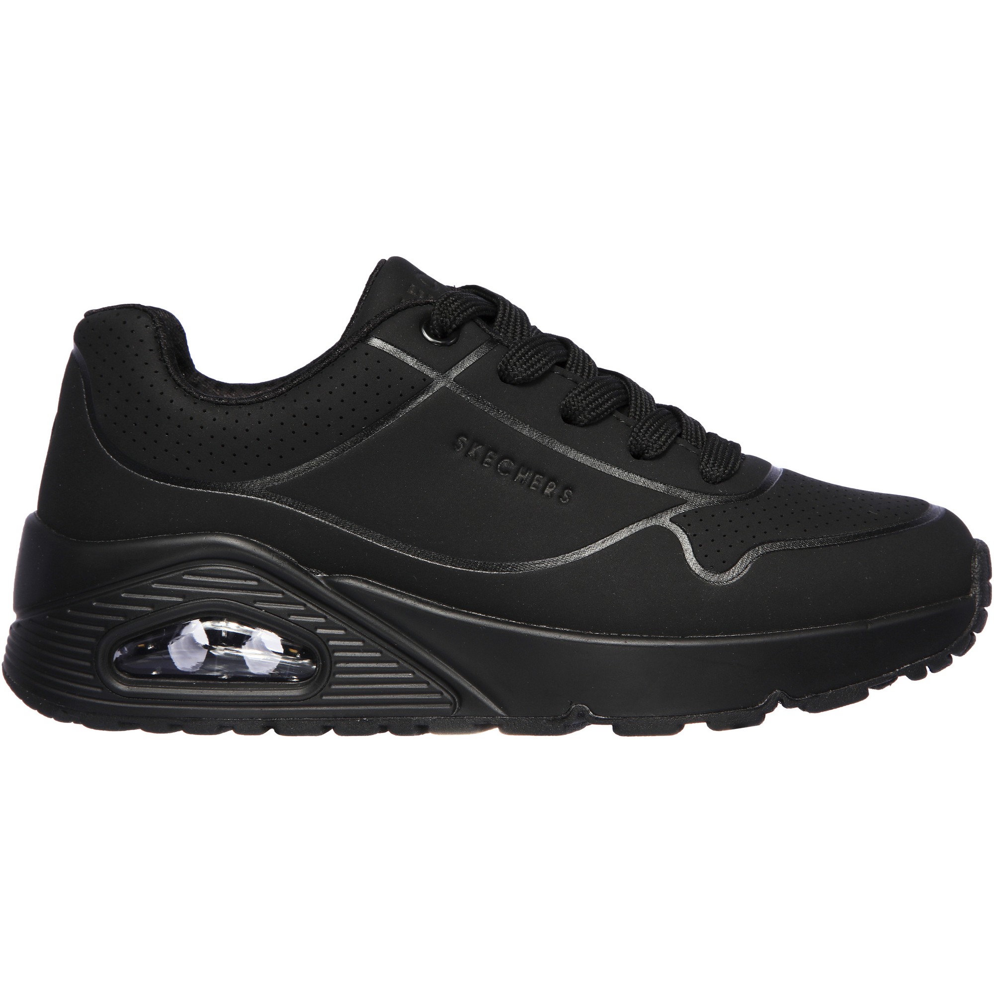 De Skechers Uno - Stand On Air schoenen voor kinderen heeft een simpel strak design. Deze schoenen hebben een gewatteerde rand en de zachte materialen hebben sneldrogende eigenschappen. Met deze schoenen loopt u comfortabel en in de tussenzool is de Skech-Air duidelijk zichtbaar. De flexibele buitenzool zorgt voor een goede grip.
