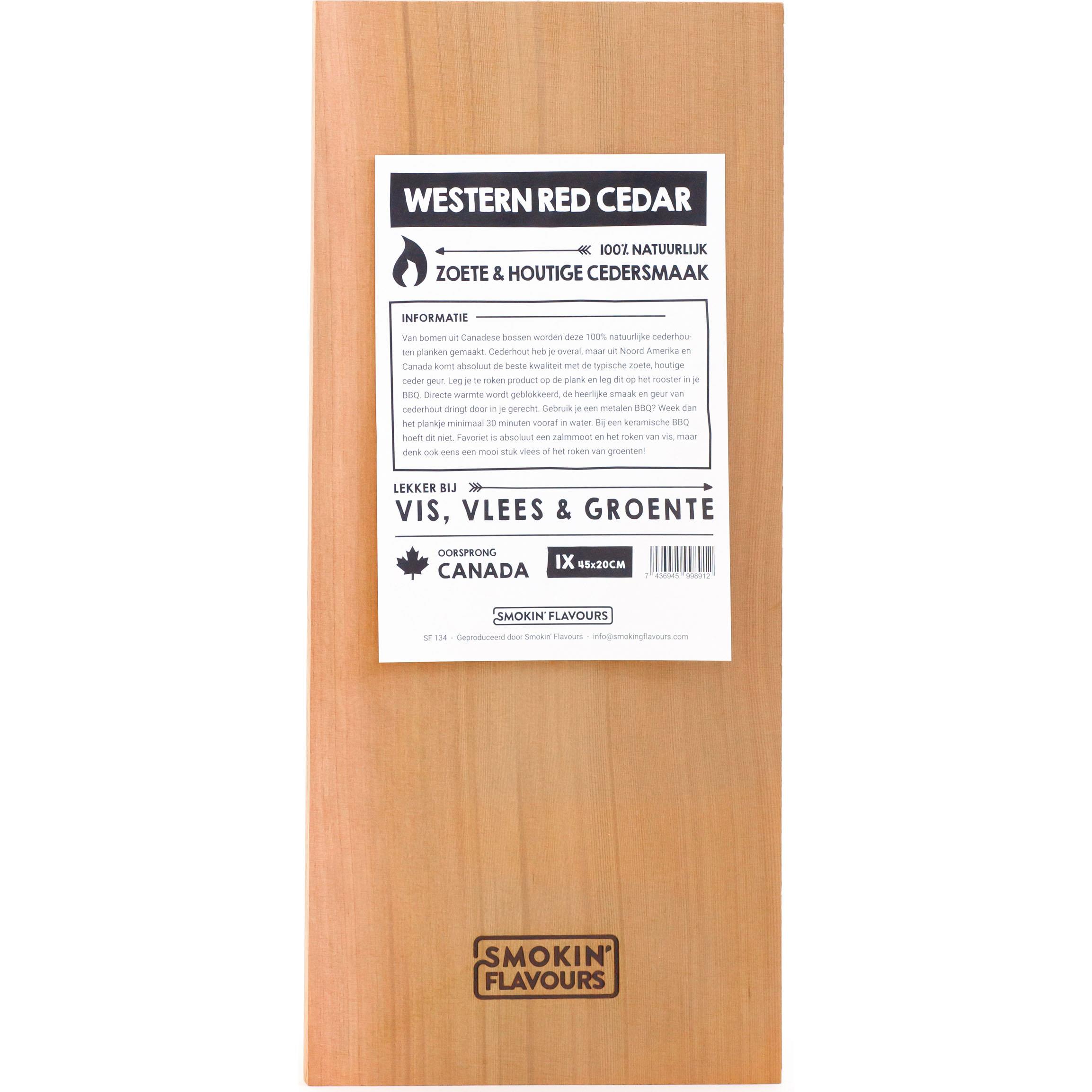 De Smokin’ Flavours Cederhouten rookplank is gemaakt van bomen uit de Canadese bossen en is dus 100% natuurlijk cederhout. Uit Noord-Amerika en Canada komen de beste kwaliteit cederhout voor met een zoete en houtige geur. Op deze Smokin’ Flavours rookplank ligt u uw product en dit legt u vervolgens op de barbecue. Directe warmte wordt door de plank geblokkeerd maar de smaak en geur van cederhout trekt wel in uw gerecht.