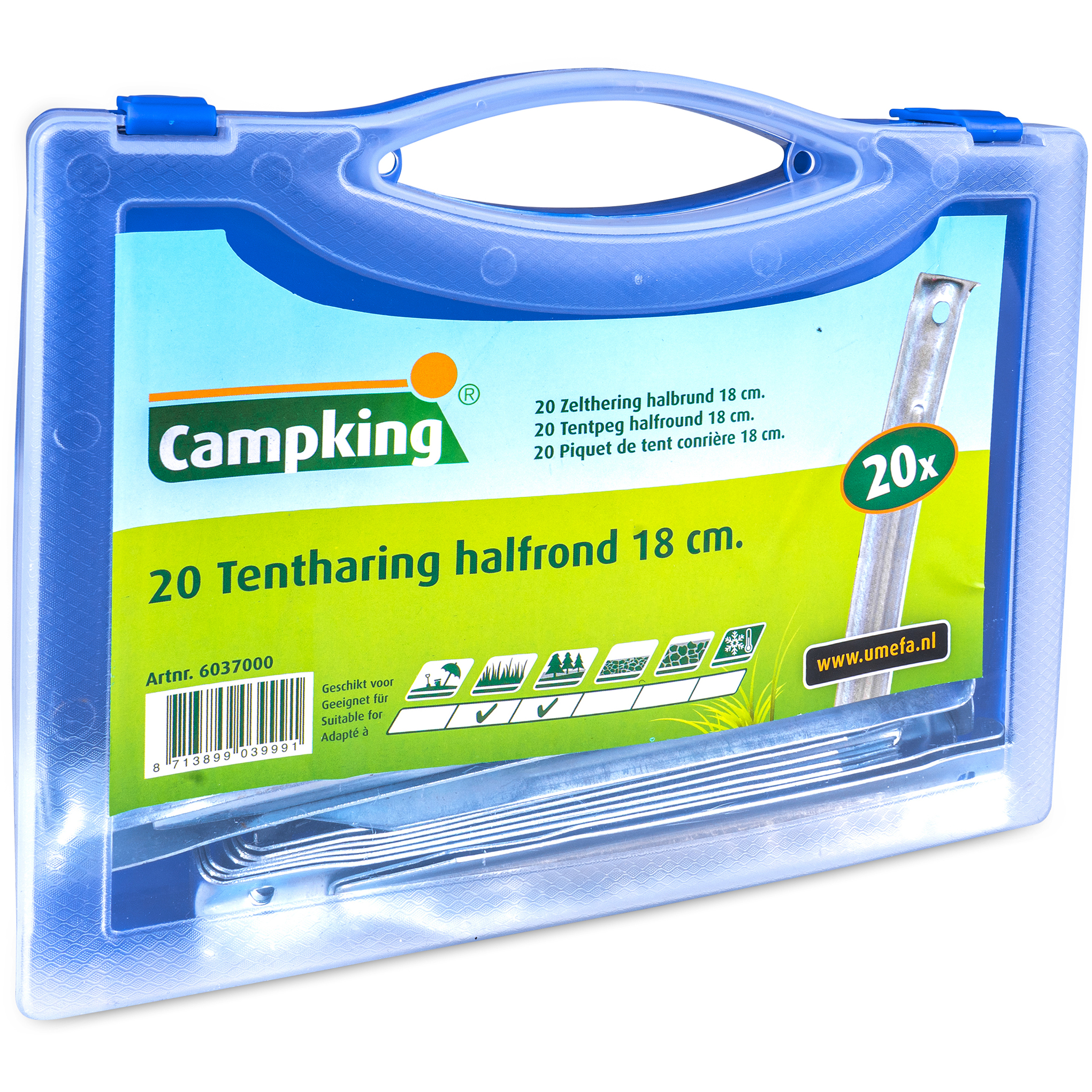 Met de Umefa Kofferset Halfrond hebt u in één keer een complete, overzichtelijke haringset mee. De lengte van 18 cm geeft uw tent of luifel betrouwbare grip op gras en vaste bodem, terwijl de koffer voorkomt dat haringen los rammelen of zoekraken. Bij De Wit Schijndel adviseren wij deze set als solide basis voor kampeerders die zonder gedoe stabiel willen opzetten.