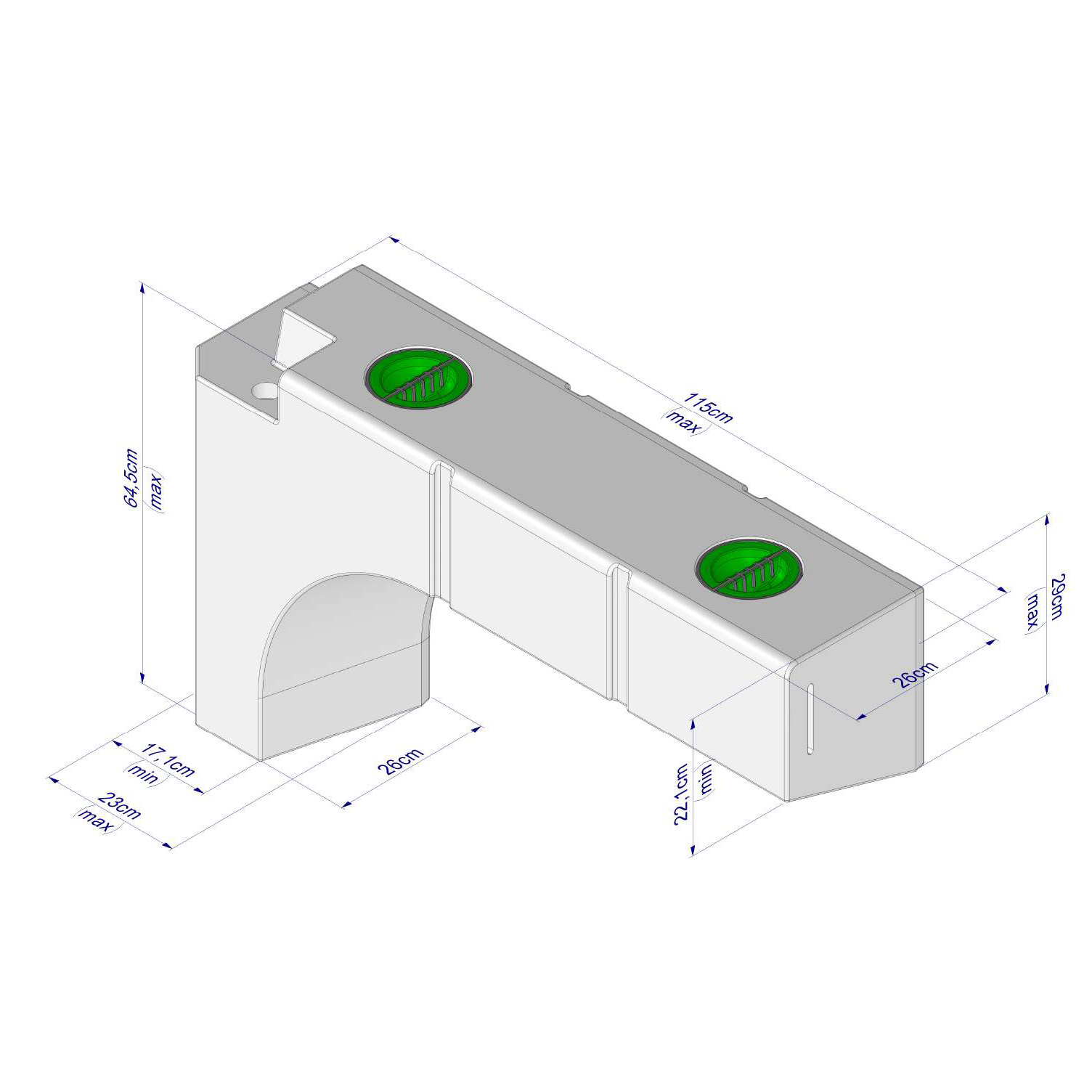 Deze Vecam watertank heeft een unieke afmeting van 115 x 64.5 x 26 centimeter met een grote bocht erin. De tank is geschikt voor de Fiat Ducato buscamper vanaf 2006. Geschikt als opslag of voor vuil- en schoonwater toepassingen. De tank bestaat volledig uit kunststof. De tank beschikt over voorgeboorde aansluitingen in de tank. Via de grote openingen aan de buitenkant is het onderhoud hiervan een stuk eenvoudiger gemaakt.